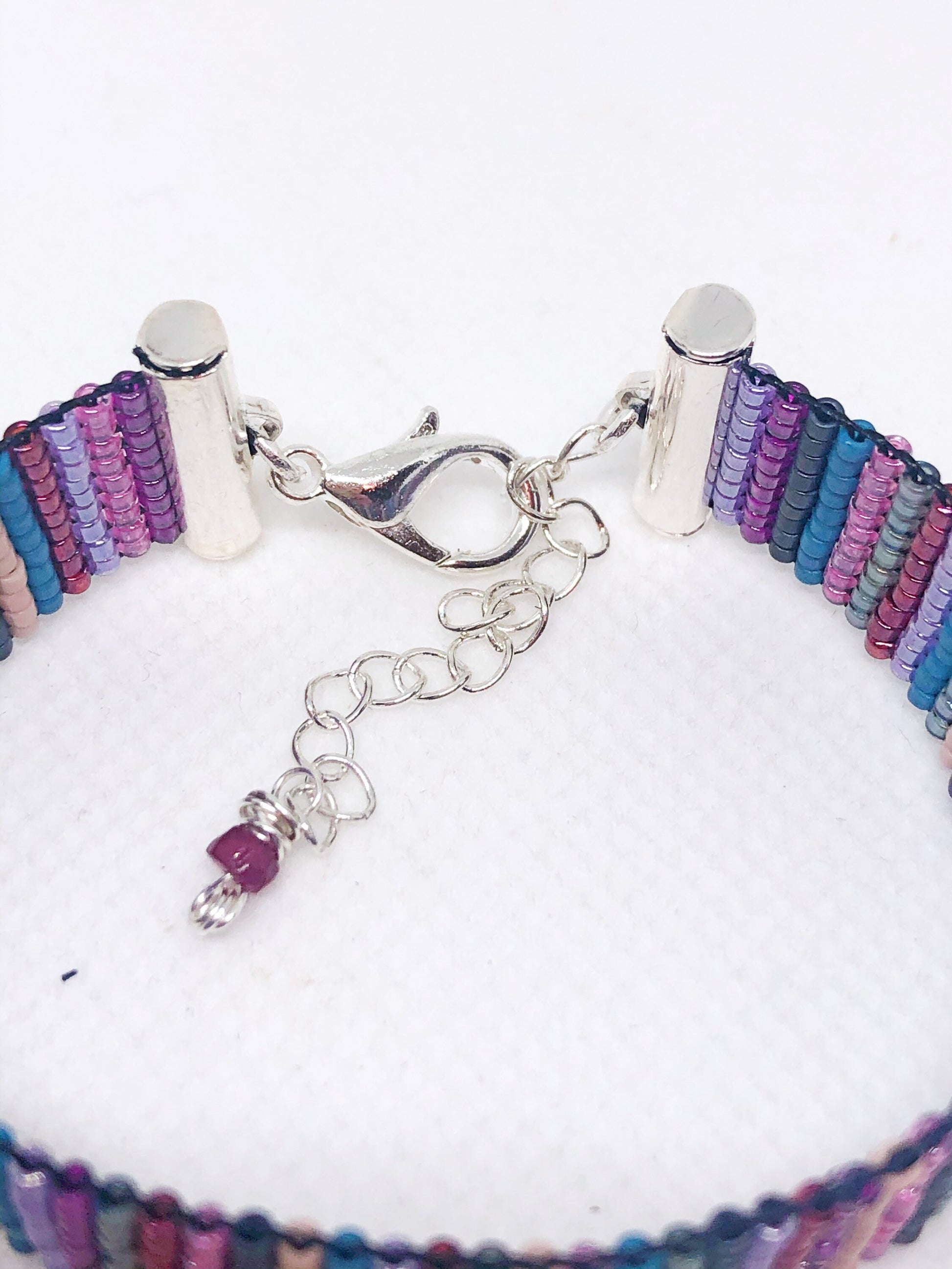 - This bracelet is hand loomed with a beautiful rainbow of glass Delica beads.