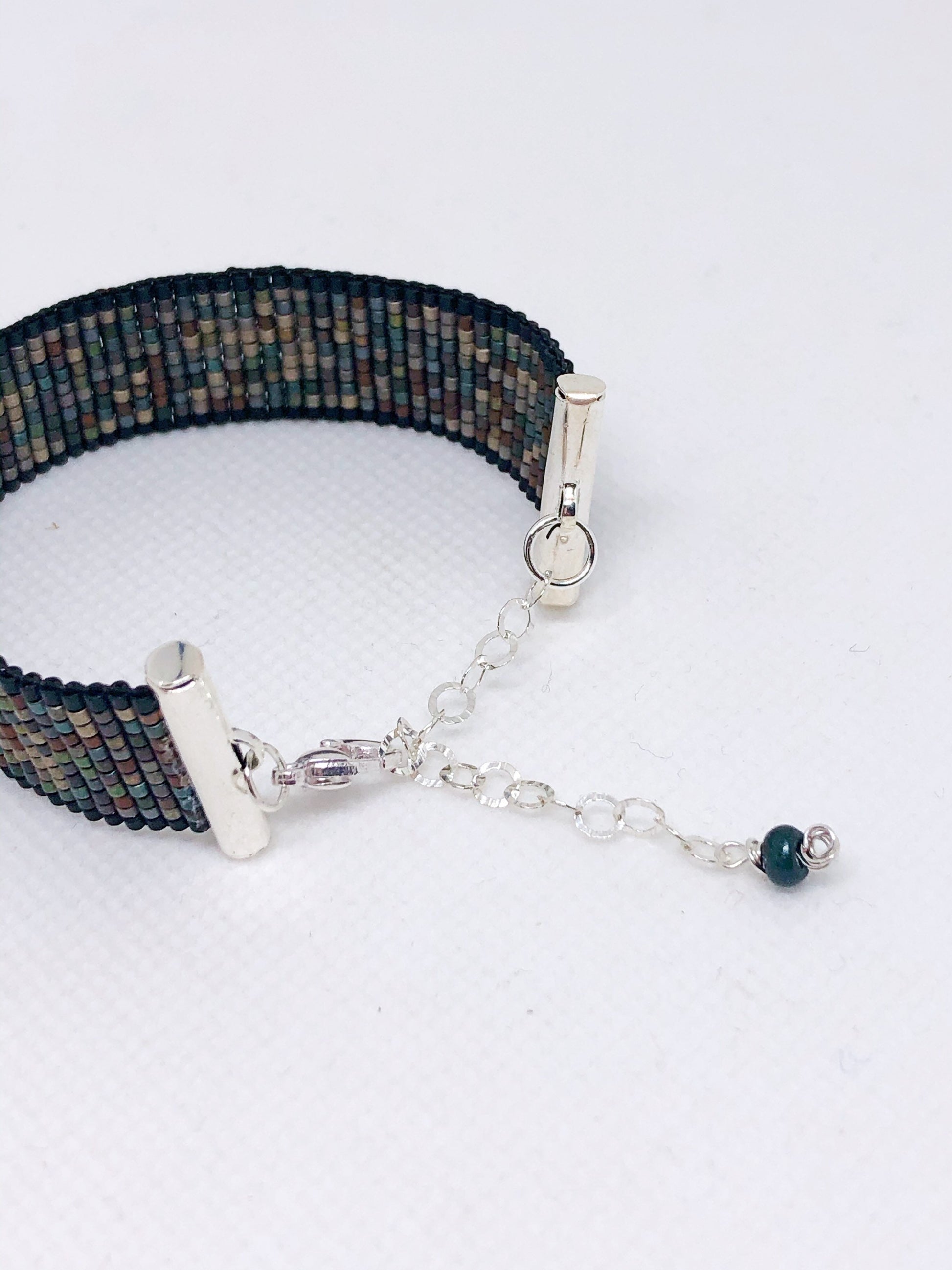 - This bracelet is hand loomed with beautiful glass Delica beads.