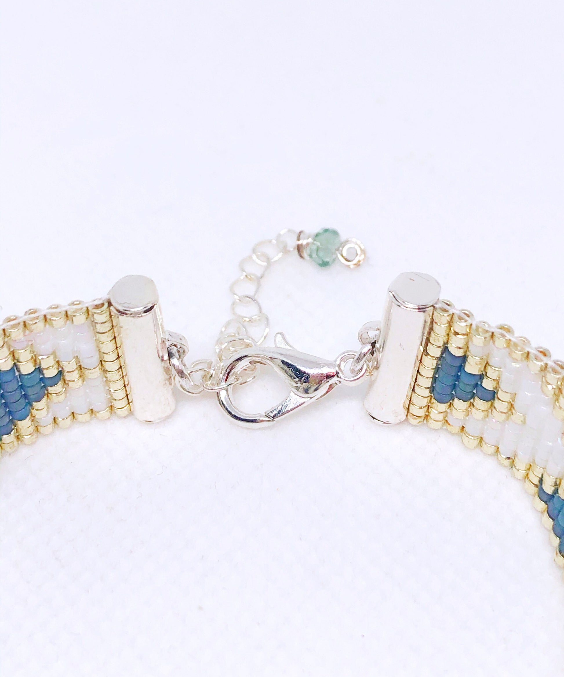 - This bracelet is hand loomed with beautiful blue, silver and white glass Delica beads.