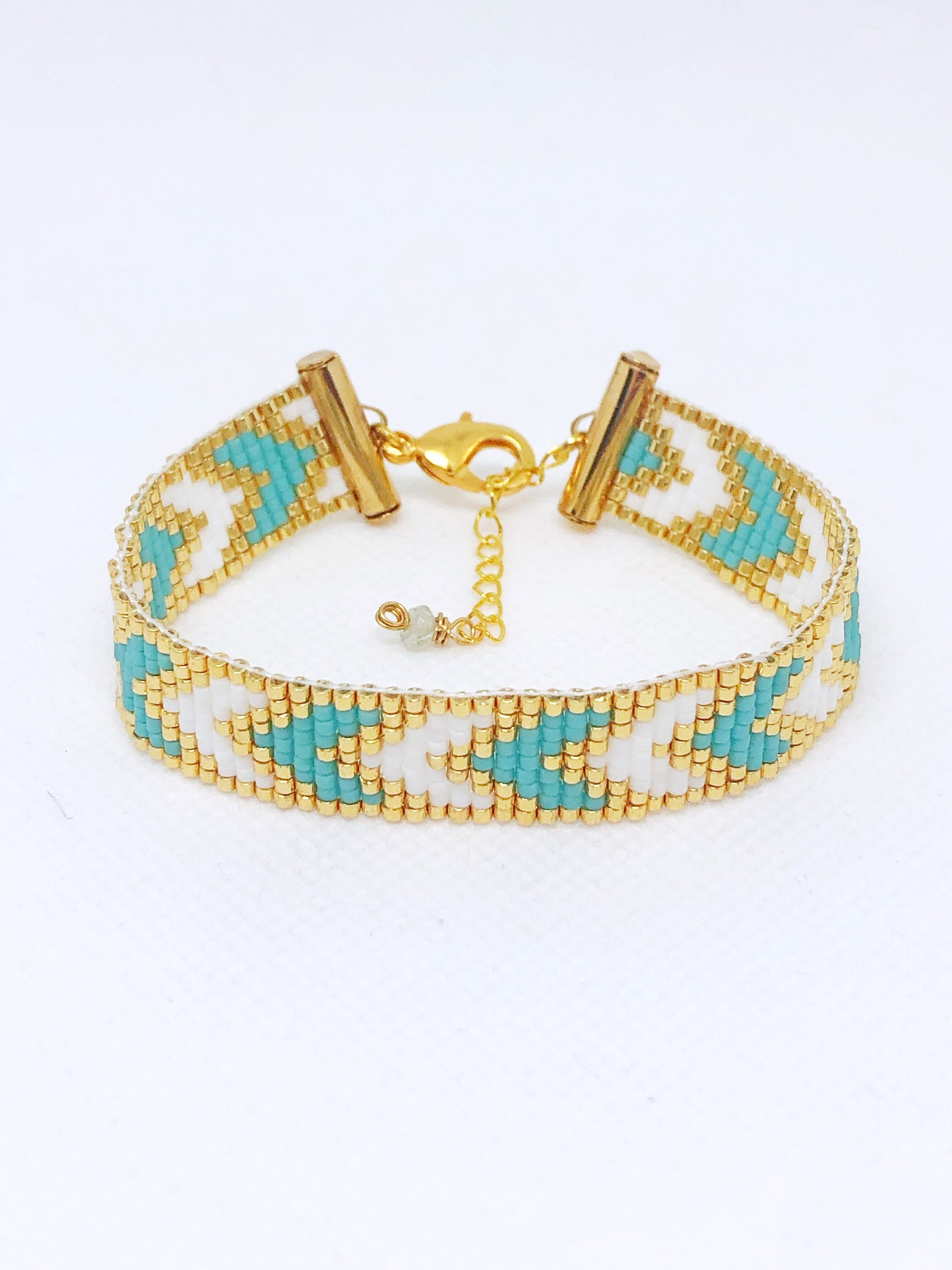 - This bracelet is hand loomed with beautiful white, turquoise and gold glass Delica beads